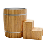 A: Same barrel, same materials. The Railing Barrel adds an integrated timber handrail for easier entry and exit. This model keeps it simple — just the barrel.