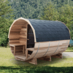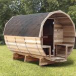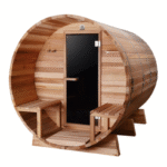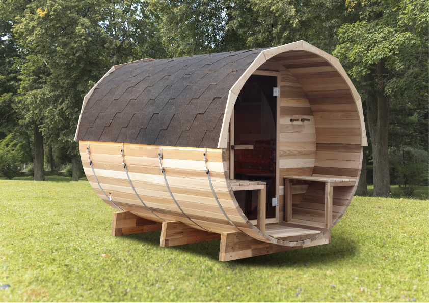 The distinctive barrel shape ensures efficient heat circulation throughout the interior. At the same time, the covered porch creates a sheltered transition space for cooling down between sessions or simply enjoying the fresh air. With a capacity for 6-8 people, this sauna is ideal for families, entertaining guests, or commercial installations at resorts and wellness facilities.