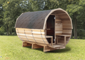 Yes, this barrel sauna is specifically designed for outdoor installation in tropical climates. Both hemlock and spliced red cedar naturally resist rot, decay, and insects. The waterproof asphalt roof shingles protect against heavy rain, while the 38mm-thick walls provide excellent insulation, even in humid conditions.