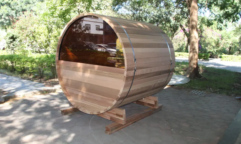 Yes, this barrel sauna is designed for outdoor installation in tropical climates. Thermo Pine and Spliced Red Cedar offer the best natural resistance to rot, decay, and insects for exposed outdoor settings. Hemlock performs well in covered outdoor areas. Spruce is recommended for indoor or fully sheltered installations. The waterproof asphalt roof shingles protect against heavy rain, while the 38mm thick walls provide excellent insulation. All window options use weather-resistant, UV-stable materials.