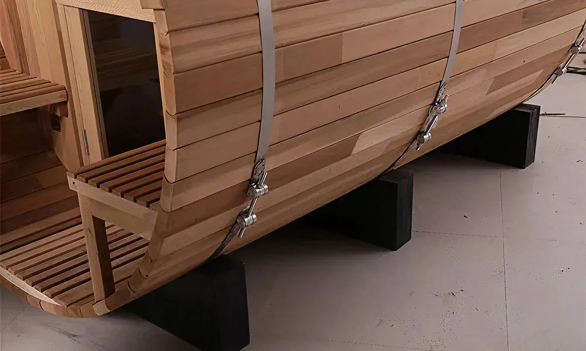 The sauna requires a level, stable surface that can support a weight of 450-500kg when occupied. Recommended options include concrete pads, paving stones, or reinforced timber decking. The surface should extend to accommodate the front porch (if selected) and allow at least 30cm clearance on all sides for ventilation and access.