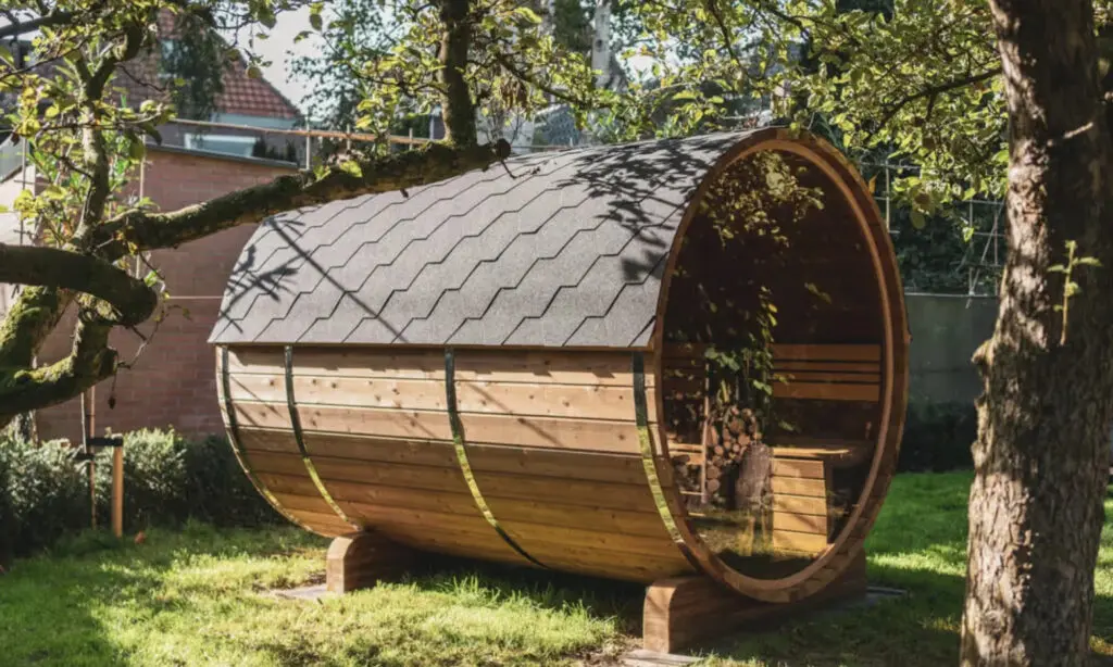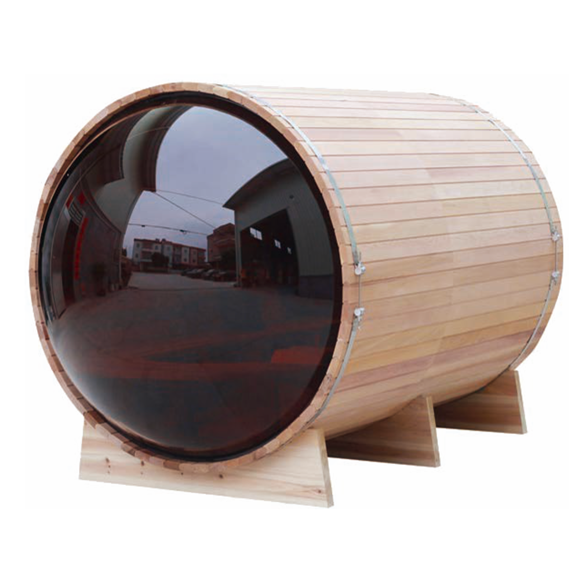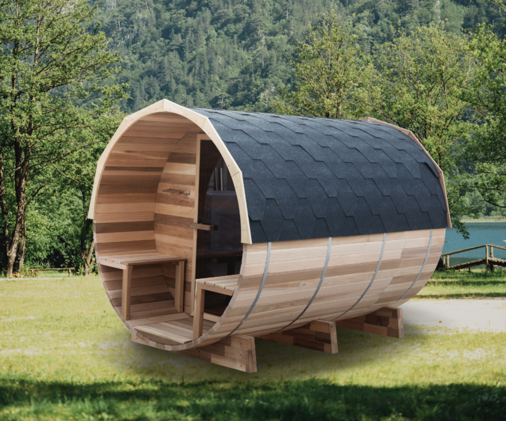 Yes, this barrel sauna is designed for outdoor installation in tropical climates. Thermo Pine and Spliced Red Cedar offer the best natural resistance to rot, decay, and insects for exposed outdoor settings. Hemlock performs well in covered outdoor areas. Spruce is recommended for indoor or fully sheltered installations. The waterproof asphalt roof shingles protect against heavy rain, while the 38mm thick walls provide excellent insulation. All window options use weather-resistant, UV-stable materials.