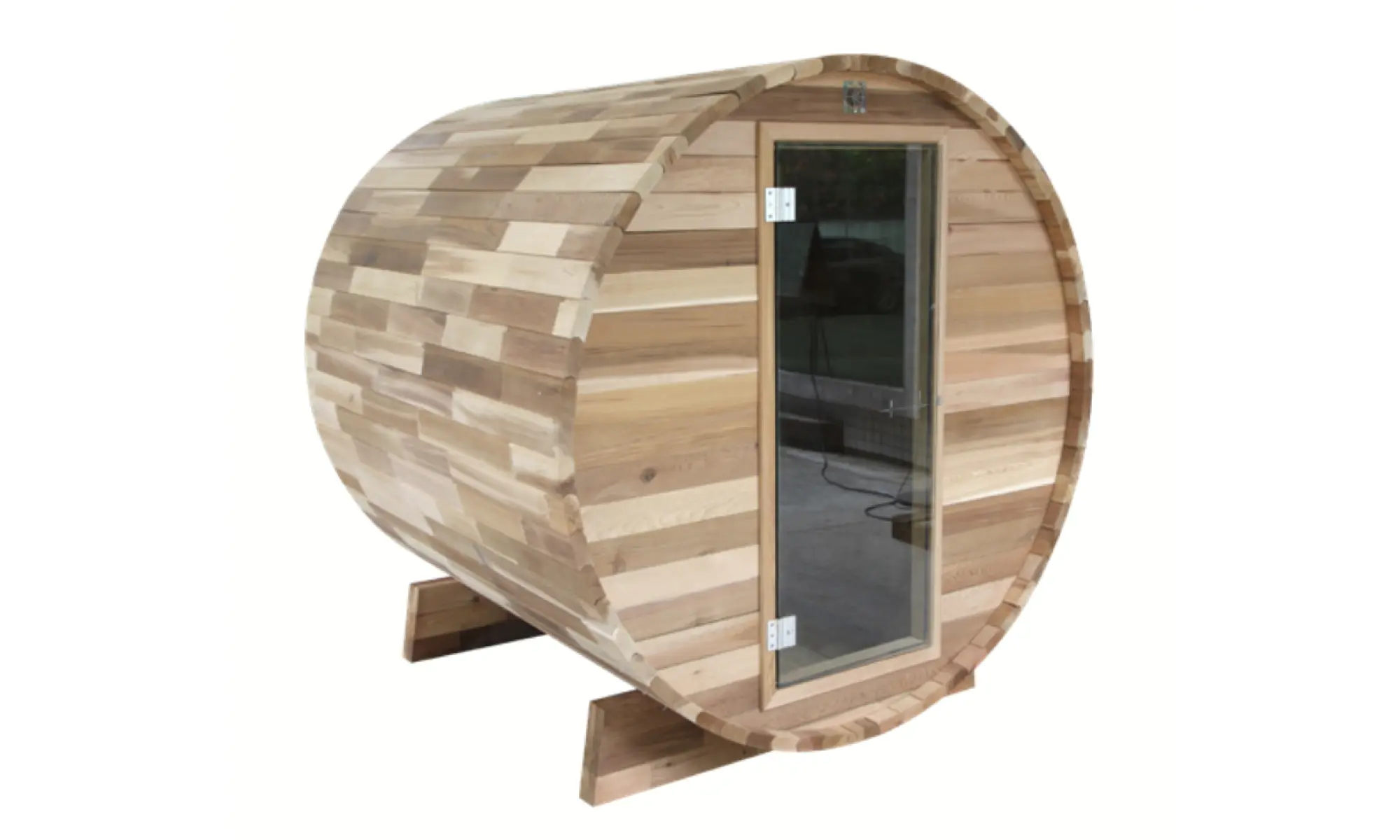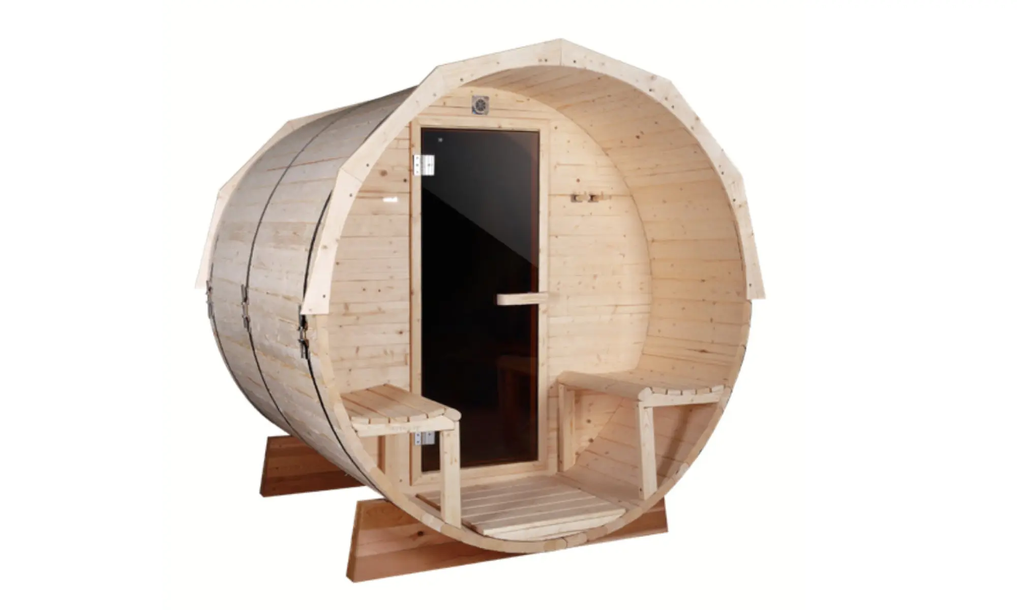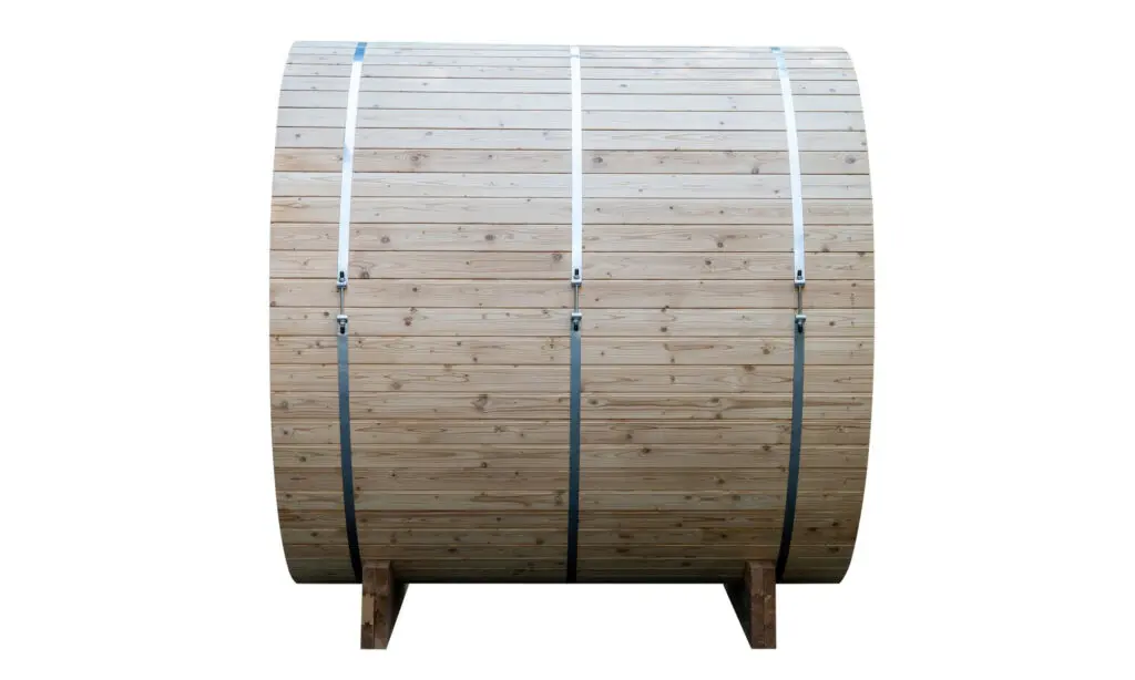 Every barrel sauna comes complete with: Box Stone Heater (TÜV Safety Certified), explosion-proof stones, explosion-proof interior light, wooden bucket and water scoop, temperature gauge, sand timer, wooden door handle, 8mm transparent tempered glass door, rubber hammer for assembly, asphalt roof shingles, and Installation Manual (English). Everything you need to get started is in the kit.