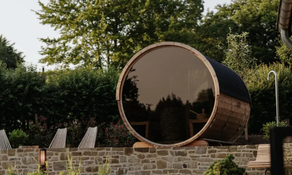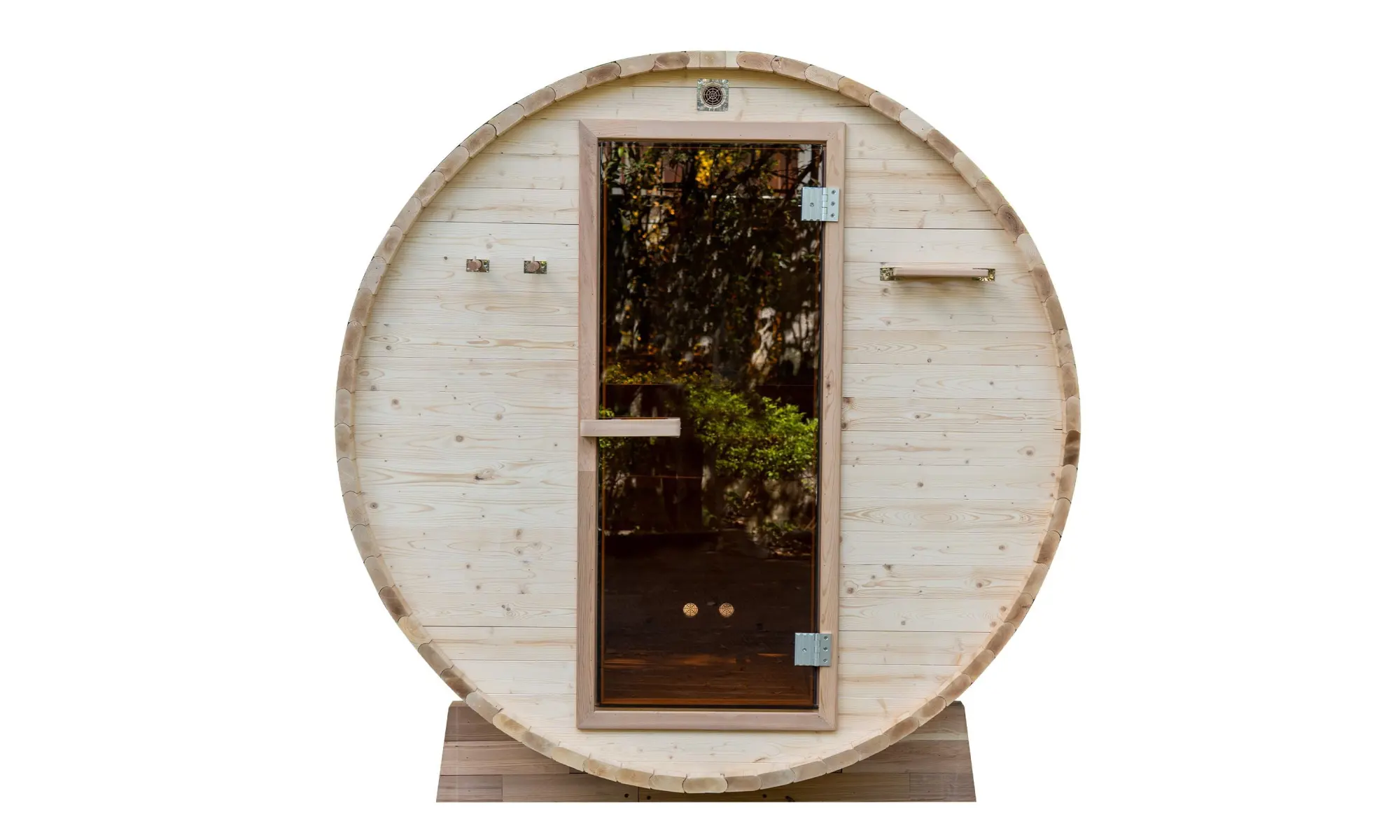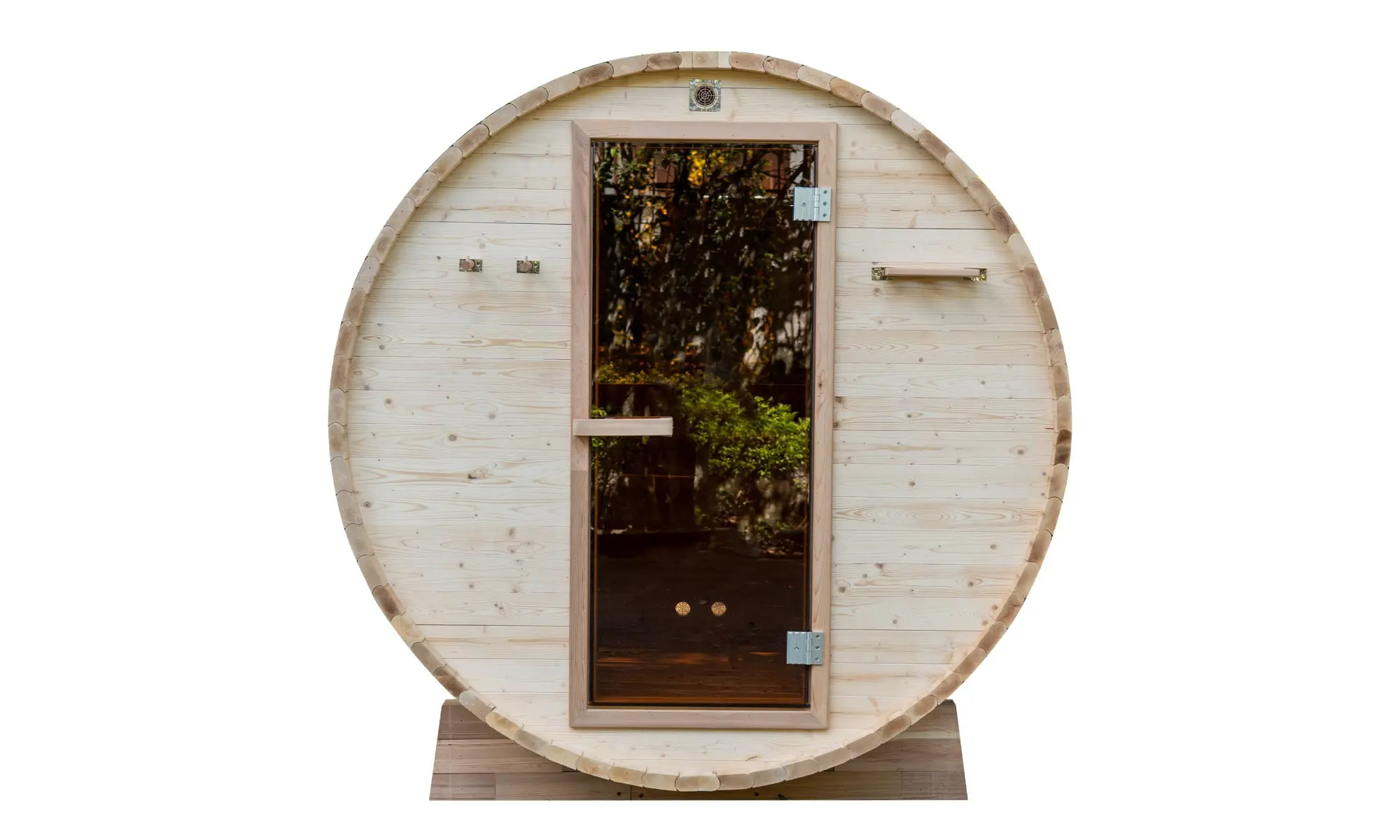 Choose from four back-end configurations. The 1/2 Window offers a curved acrylic panel that floods the interior with natural light while maintaining a traditional sauna feel. The Full Flat Window maximises your view with a large flat glass panel. The Full Curved Panoramic Window provides the most expansive visual experience, wrapping around the barrel’s curve for stunning 180-degree views. No Window gives a fully enclosed traditional barrel sauna experience with maximum heat retention.