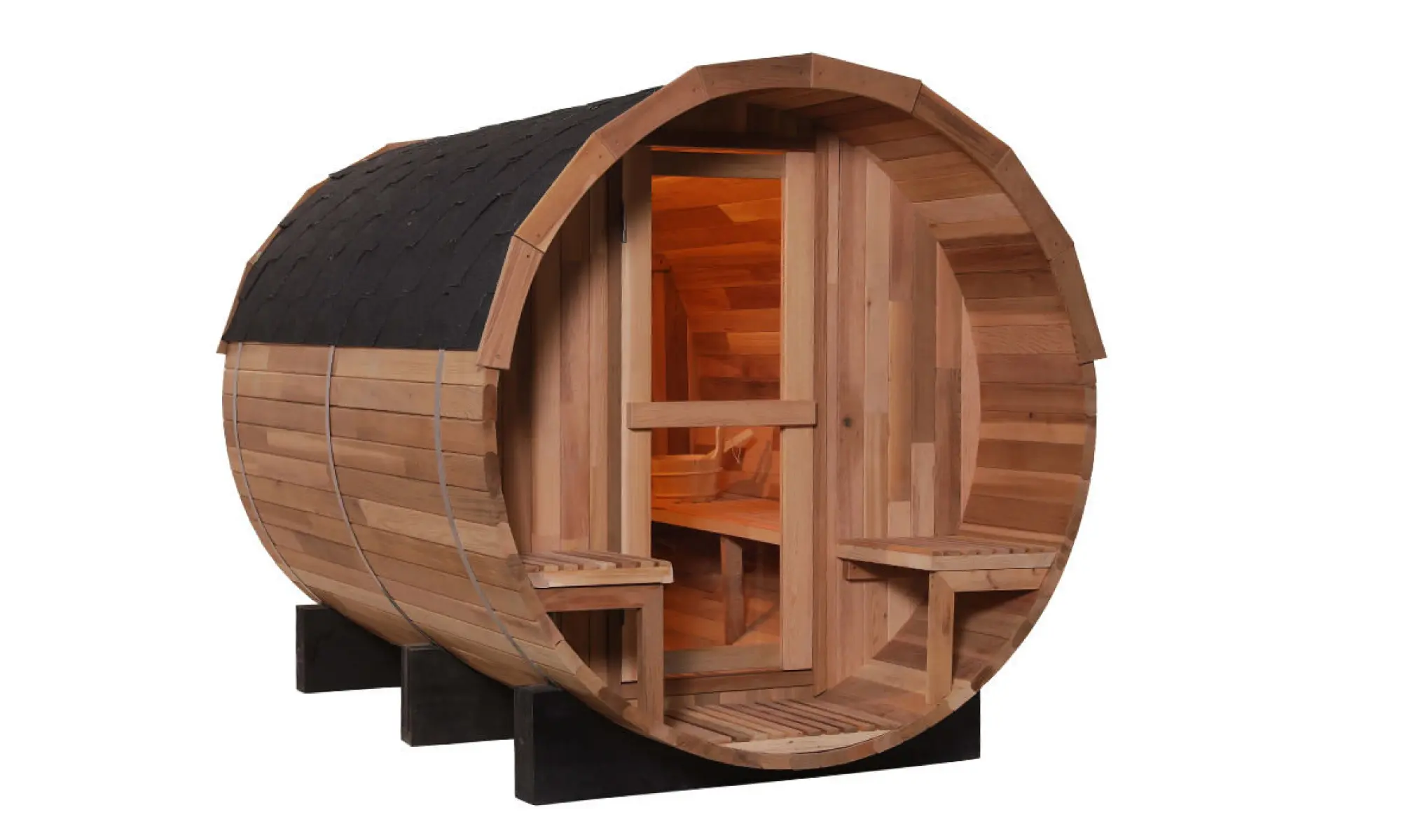 Every barrel sauna comes complete with: pre-assembled 1/2 window section with curved interior bench, Box Stone Heater (TÜV Safety Certified), explosion-proof stones, explosion-proof interior light, wooden bucket and water scoop, temperature gauge, sand timer, wooden door handle, 8mm transparent tempered glass door, rubber hammer for assembly, asphalt roof shingles, and Installation Manual (English). Everything you need to get started is in the kit.