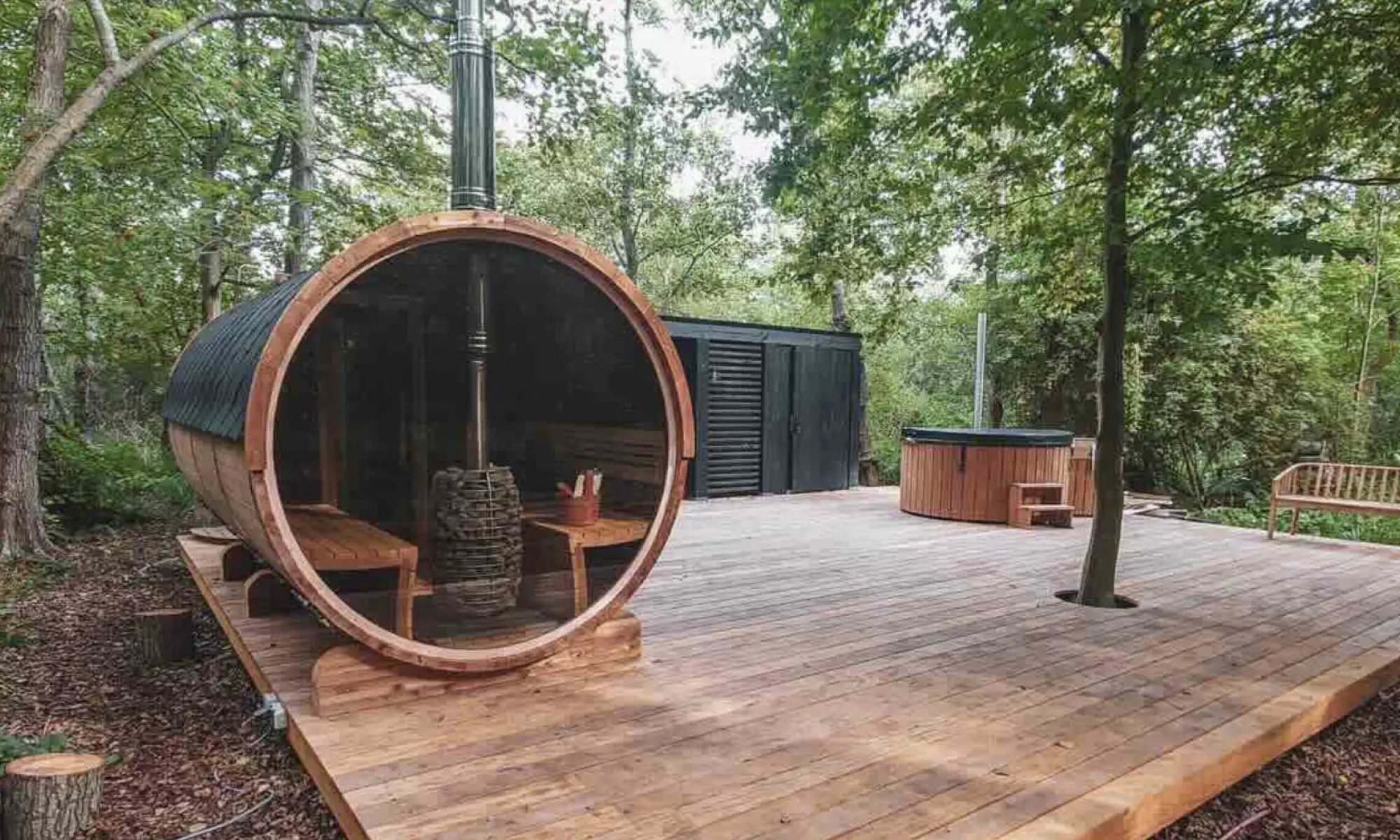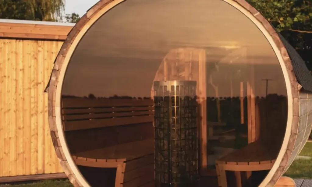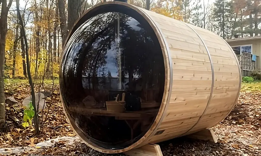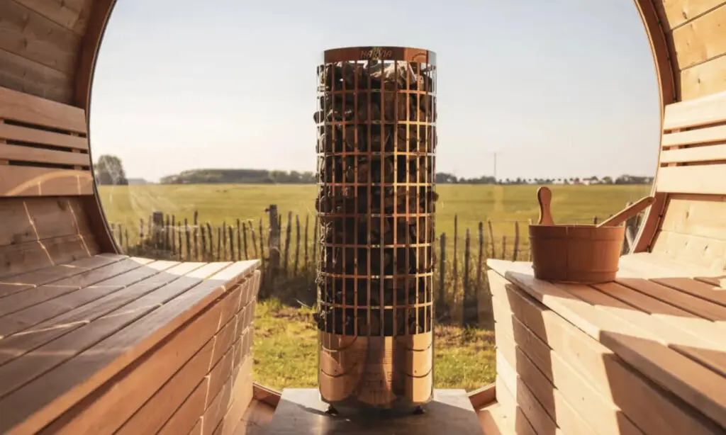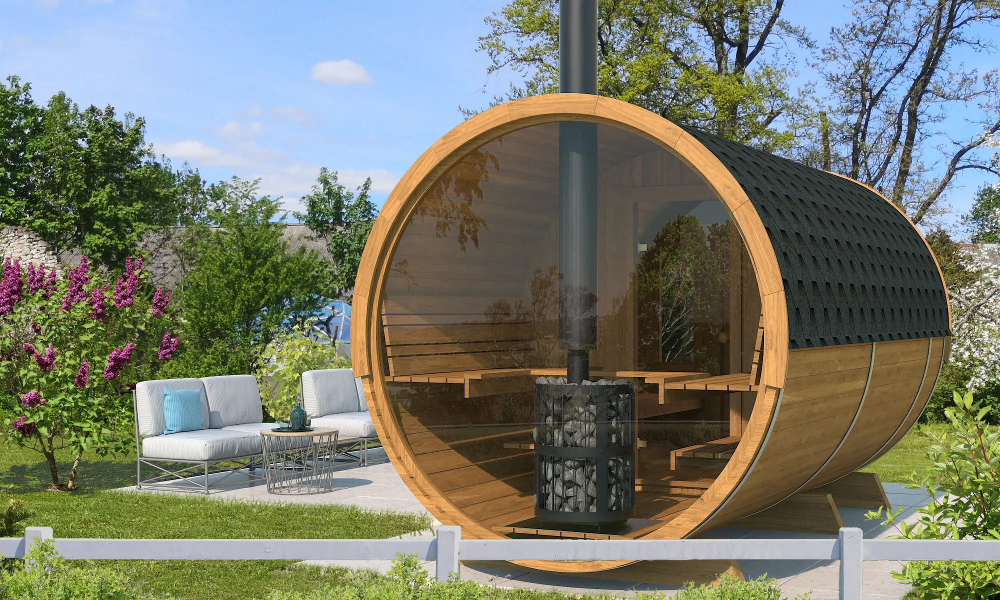 The generous interior comfortably seats 6 to 8 people, with the curved window section adding extra interior space and creating a bright, open atmosphere. The classic barrel shape ensures efficient heat circulation and even temperature distribution throughout the space.