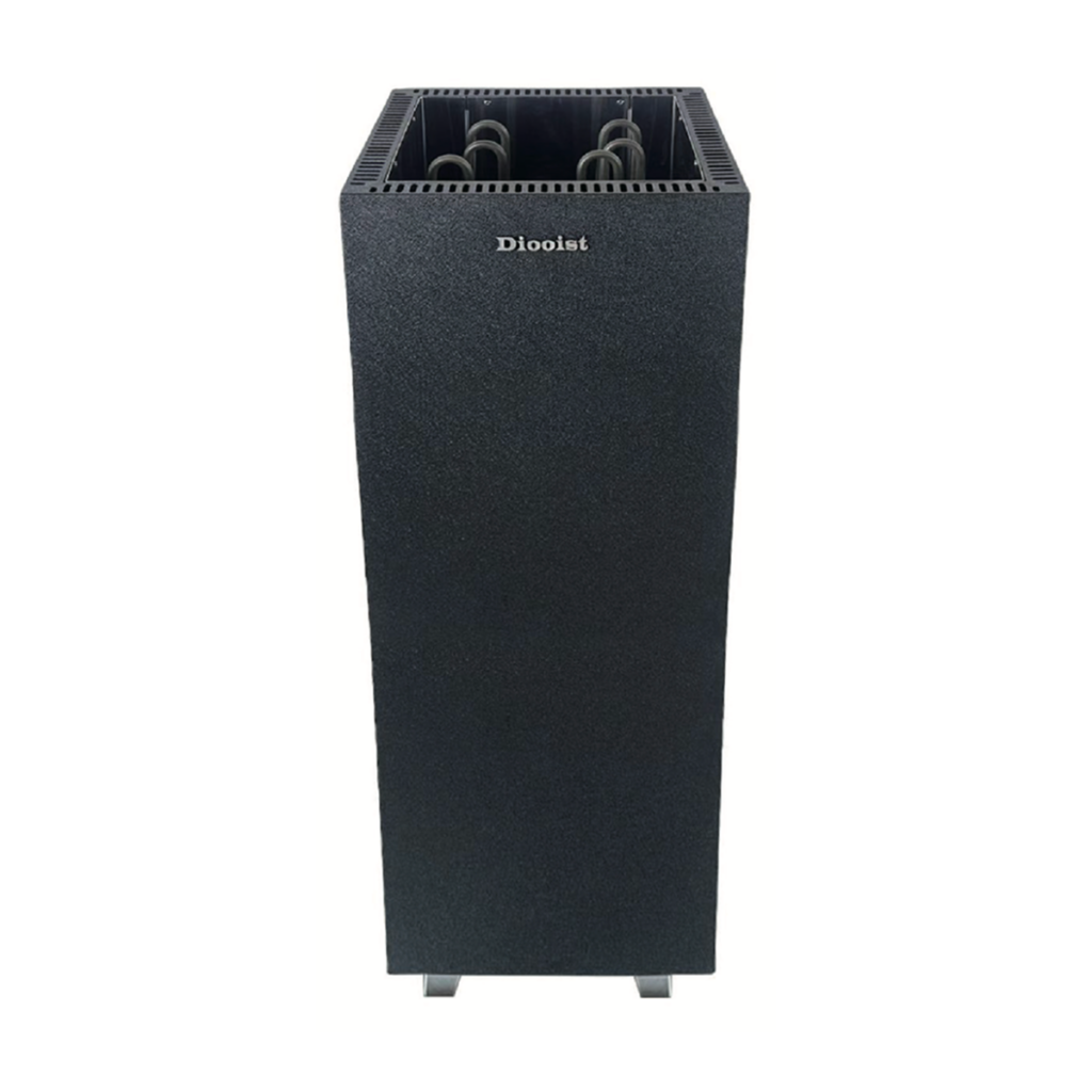 The Prism heater can be floor-mounted or wall-mounted, depending on your sauna layout. The compact footprint and tall profile suit corner installations. Maintain a minimum 40cm clearance between the top of the heater and the ceiling.