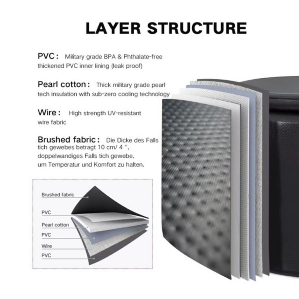 Drop stitch is a manufacturing technique that connects the top and bottom layers of the tub with thousands of threads. When inflated, this creates rigid, hard walls that hold their shape – similar to inflatable paddle boards. It’s much sturdier than regular inflatable products.