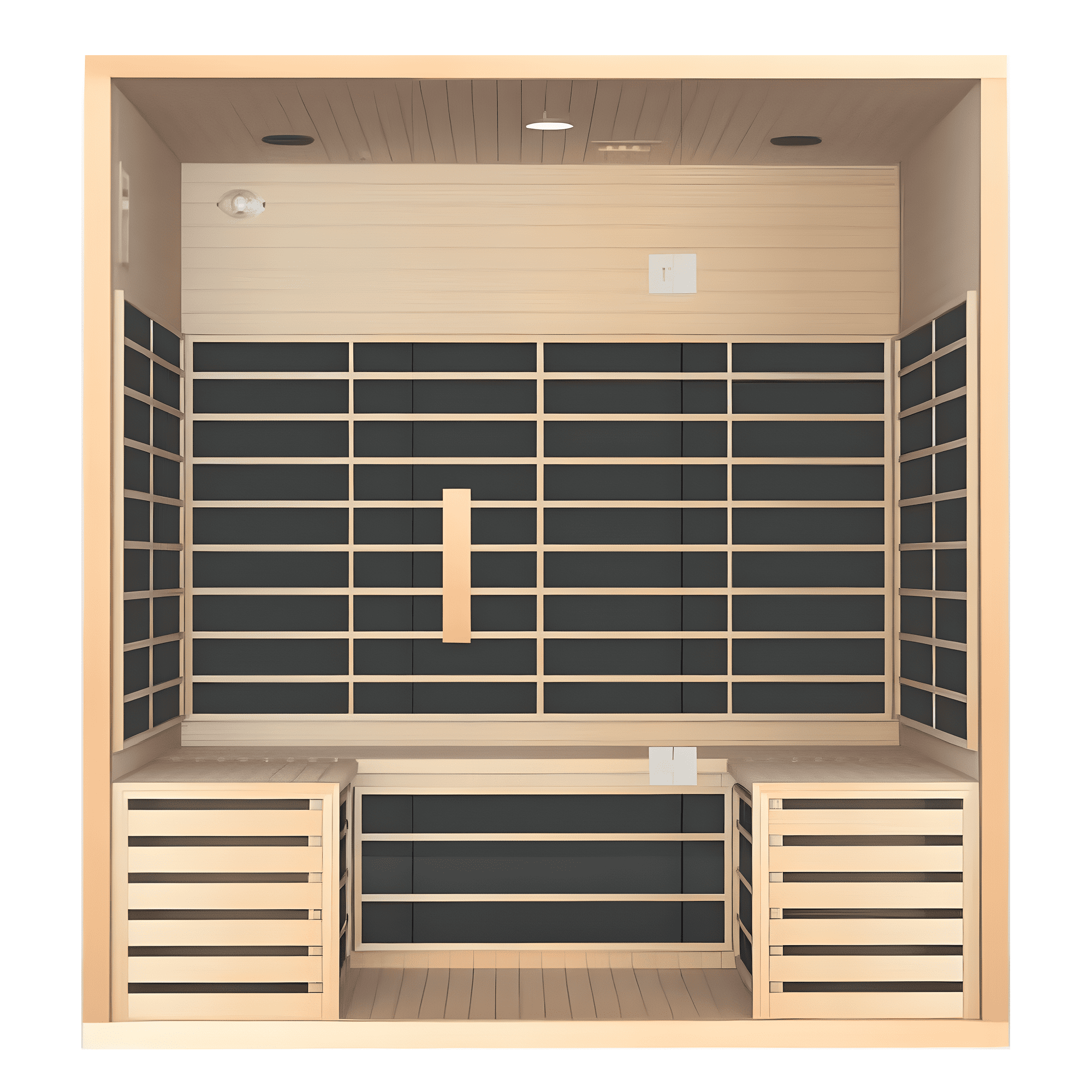 Every Nallak Indoor Infrared Sauna comes complete with: Hemlock timber cabin, tempered glass door, far-infrared carbon panels, digital controller, Bluetooth speakers, chromotherapy lighting, interior light, bench seating, floor mat, magazine holder, and installation manual.