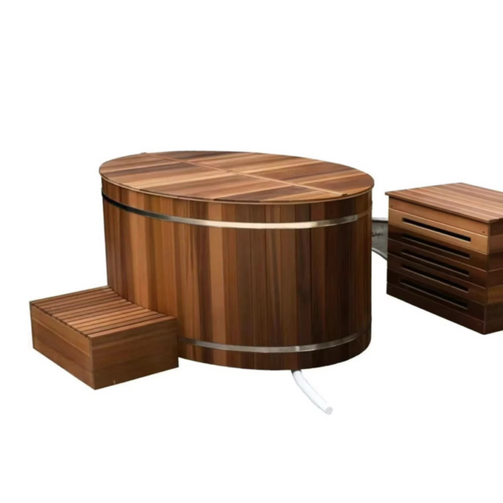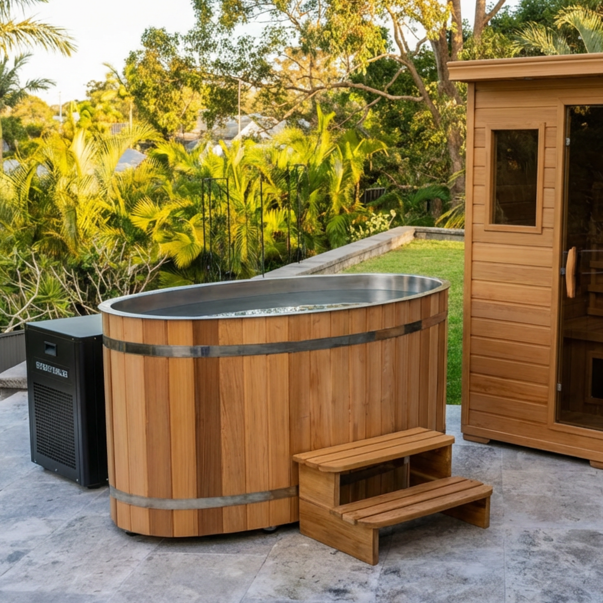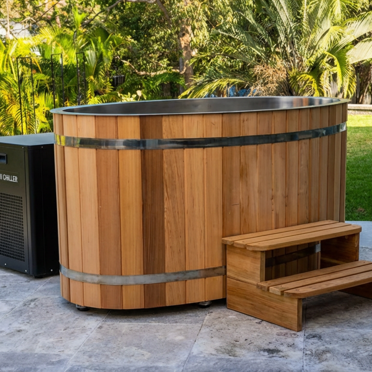 The Sanuk Oval Ice Bath combines beautiful Red Cedar craftsmanship with a hygienic stainless steel interior. This premium cold plunge tub is built to last, designed for daily use, and stunning enough to be a centrepiece in any garden or wellness space.