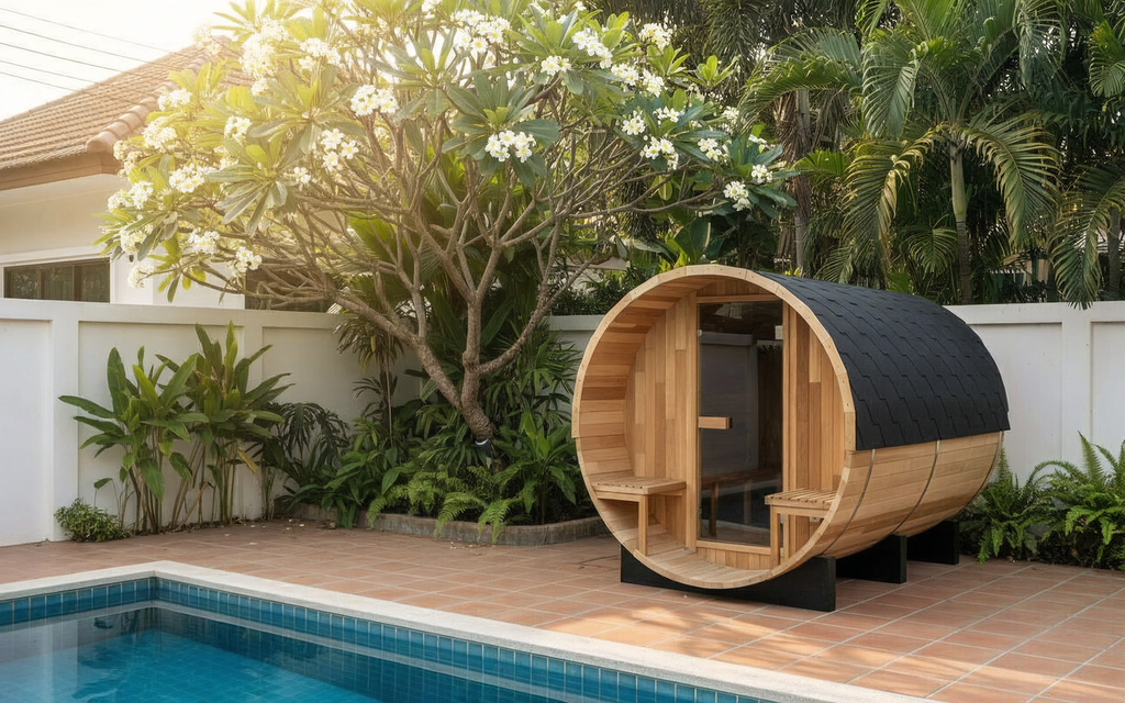 The iconic curved silhouette of a traditional barrel sauna — handcrafted in Thailand by our Finnish master builder. This timeless design combines Nordic heritage with proven thermal efficiency, creating a striking focal point for any outdoor space.