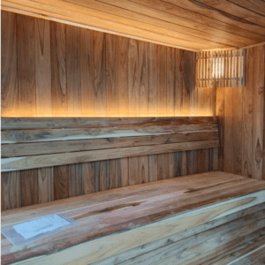The same Finnish-crafted timber rooms you'd expect from Sisu — built in Thailand, designed for Thailand's climate — with infrared heating panels integrated in place of a traditional stone heater. All the craftsmanship, none of the steam.