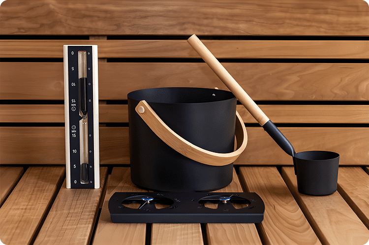 Modern sauna essentials included — bucket, ladle, timer, and aromatherapy holder with sleek matte-black finish.