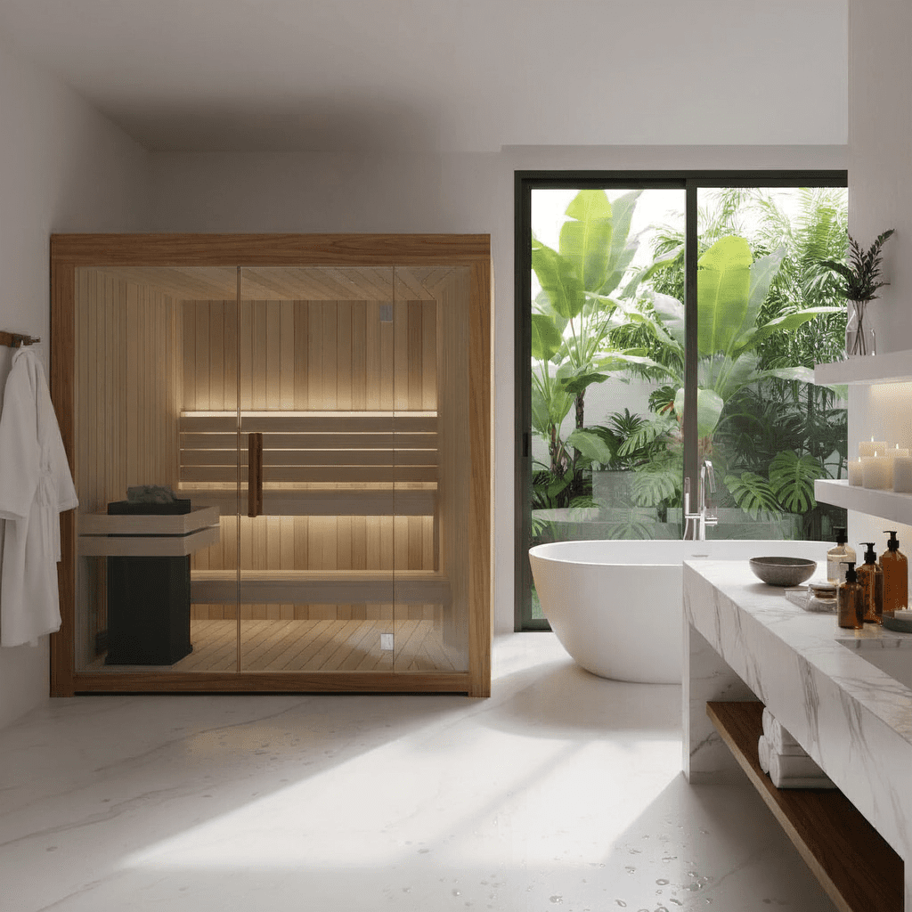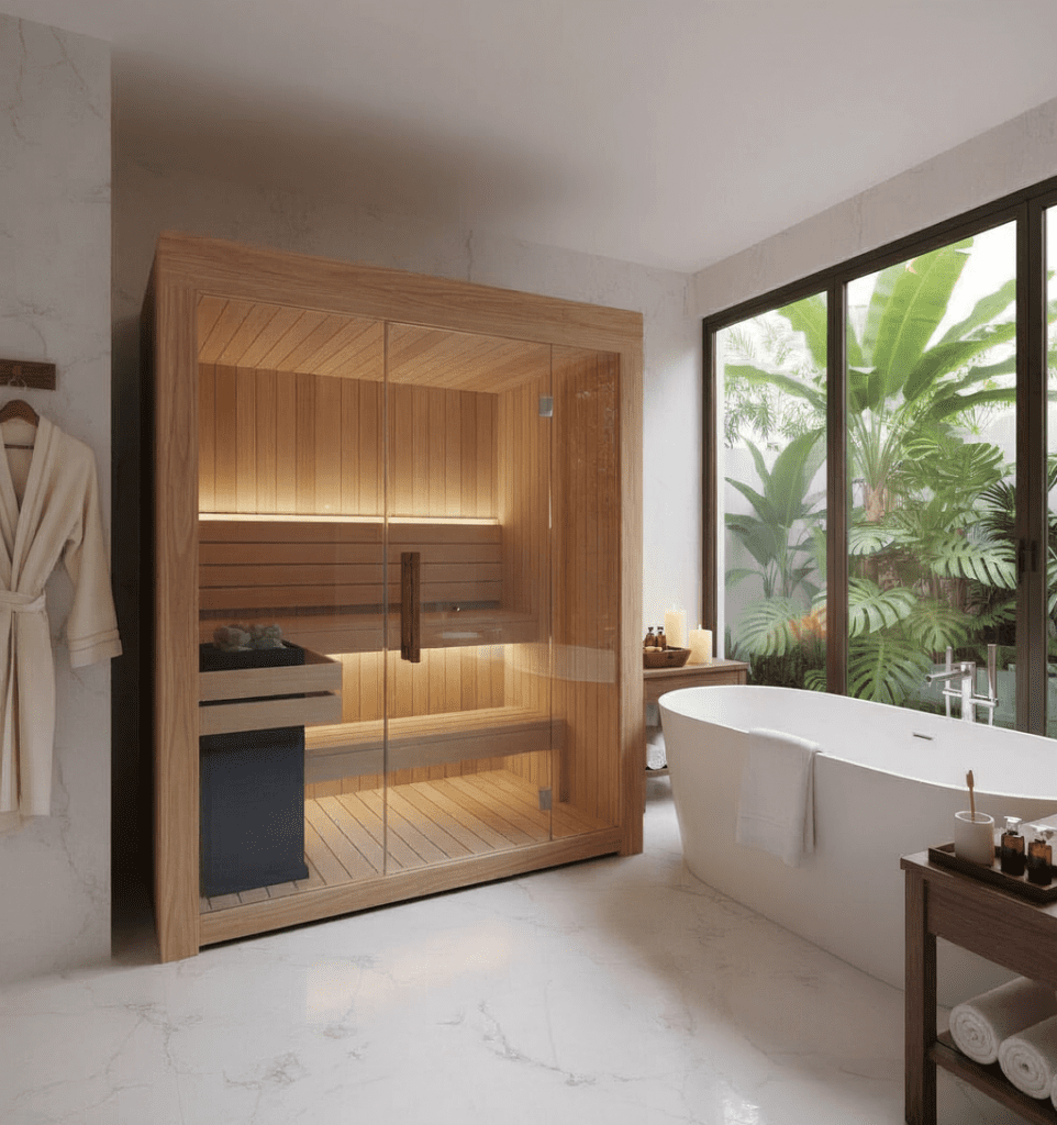 A handcrafted, Finnish-quality indoor sauna designed for homes, hotels, spas, and wellness spaces in Thailand.
