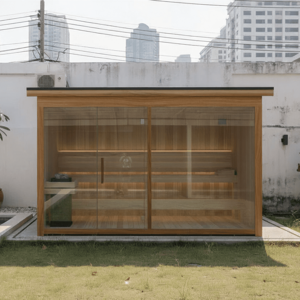 Proper timber selection. Red cedar, thermo pine, or quality spruce that’s been kiln-dried and (ideally) treated for tropical conditions. Teak works exceptionally well for outdoor saunas here. Avoid cheap, untreated softwoods that will warp, crack, or attract termites.
